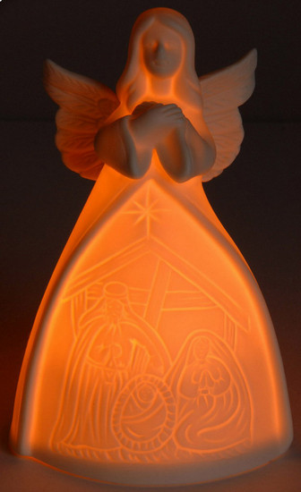 Svítící porcelánový andělíček z bílého porcelánu s oranžovou LED uvnitř, rozměr - 10,8 x 8,8 x 15,7cm, 2x baterie LR44 součástí balení. Krásná svítící keramická dekorace.